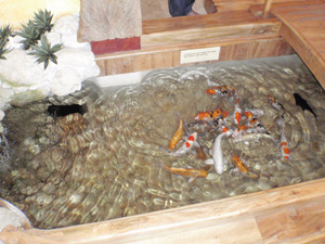 The finer Japanese restaurants typically put multicolored fish in small ponds. They are like giant goldfish and are beautiful to watch. These colorful fish are referred to as “Japanese carp,” but are more properly known as koi.